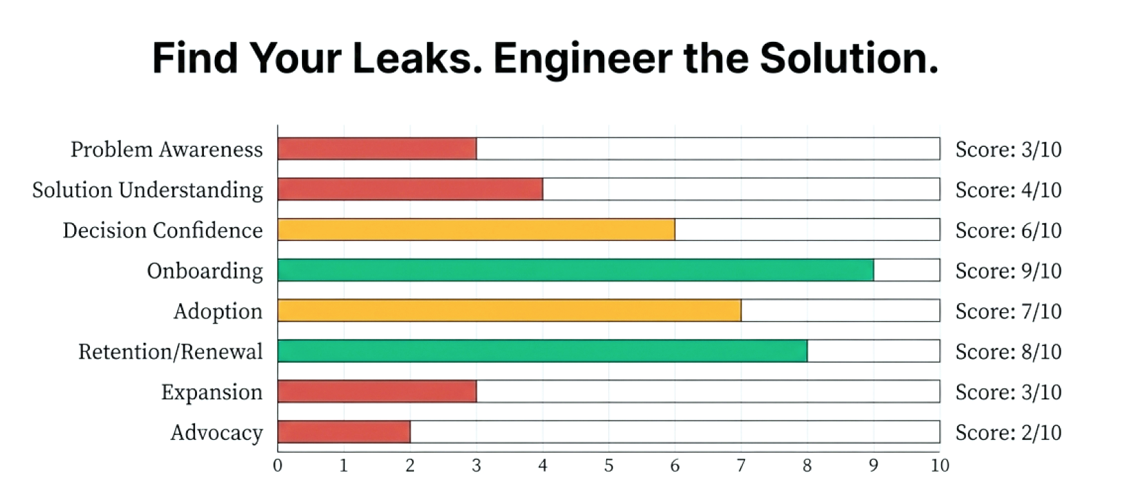 The scorecard differs from traditional audits in three critical ways. First, it breaks pre-sale into distinct stages. Most companies lump "top of funnel" together, which obscures where deals actually stall. The scorecard separates problem awareness (Do prospects recognize they have a problem?), solution understanding (Do they know what solution category they need?), and decision confidence (Are they ready to commit?). Each stage demands different content. Each leaks revenue differently when underserved.